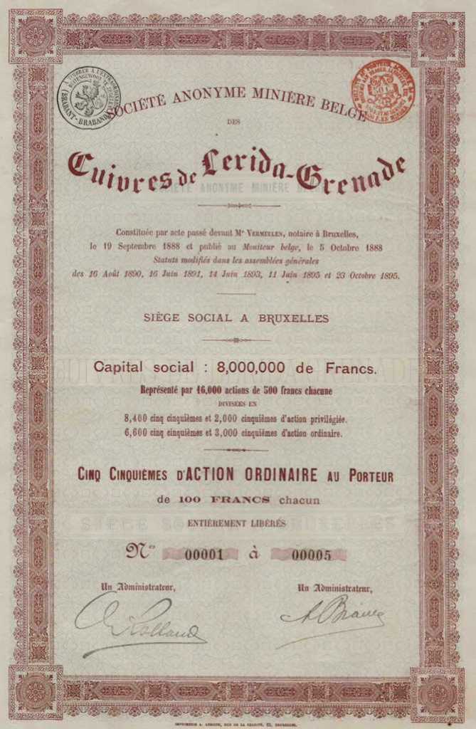 1895 Título de cinco Acciones ordinarias al portador
