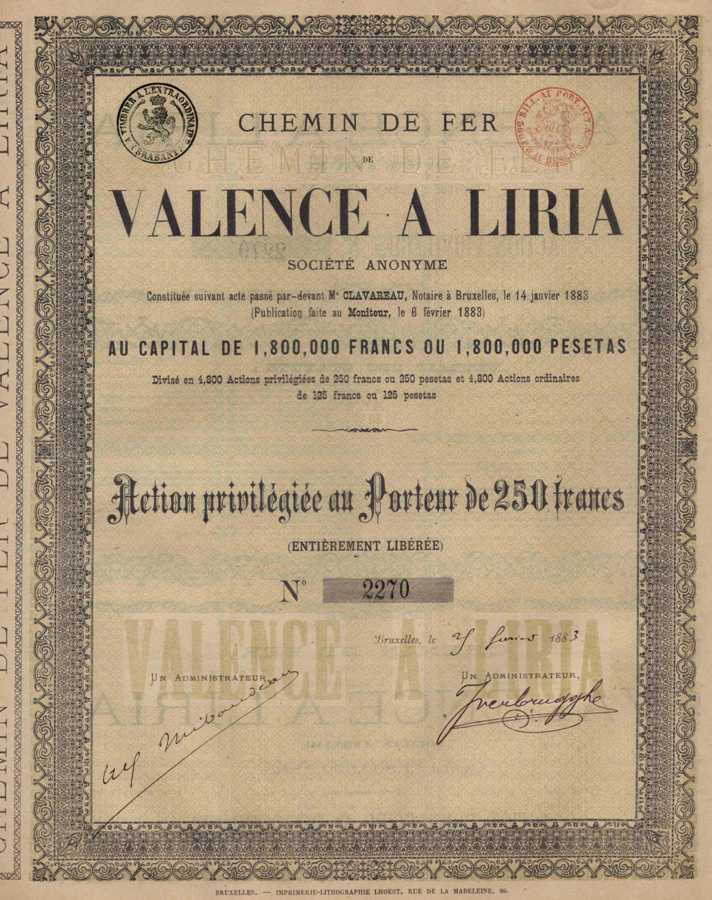 1883 Caminos de Hierro de Valencia a Liria. Acción privilegiada al portador, 250 Francos.