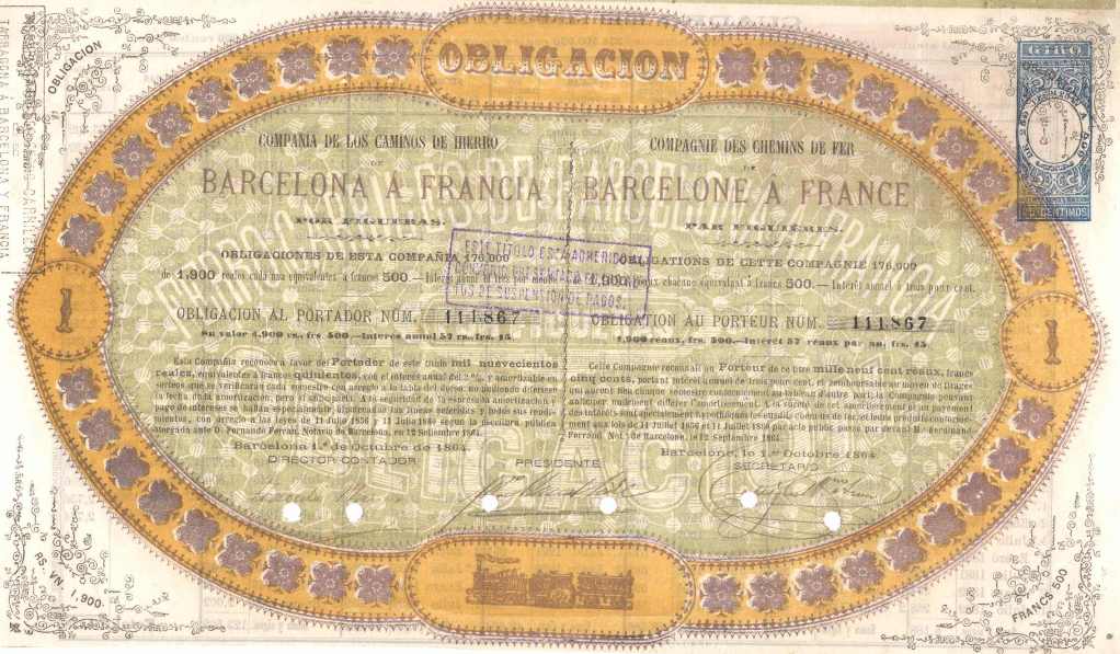 1864 Obligación al portador de 1900 Reales cada una, 500 francos.