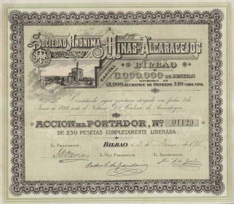 1898 Acción al Portador de 250 Pesetas Completamente Liberada.