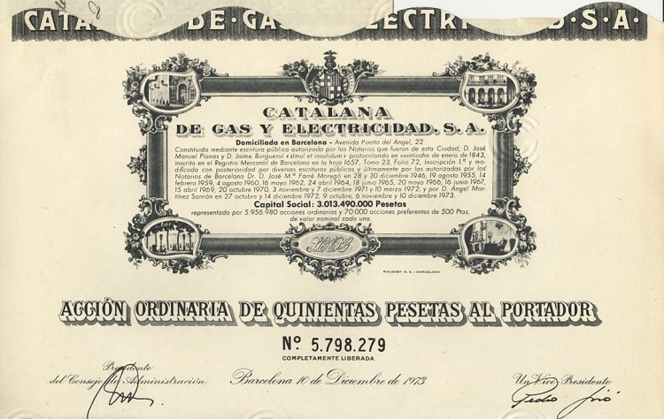 1973 Acción ordinaria de 500 pesetas al portador, completamente liberada.