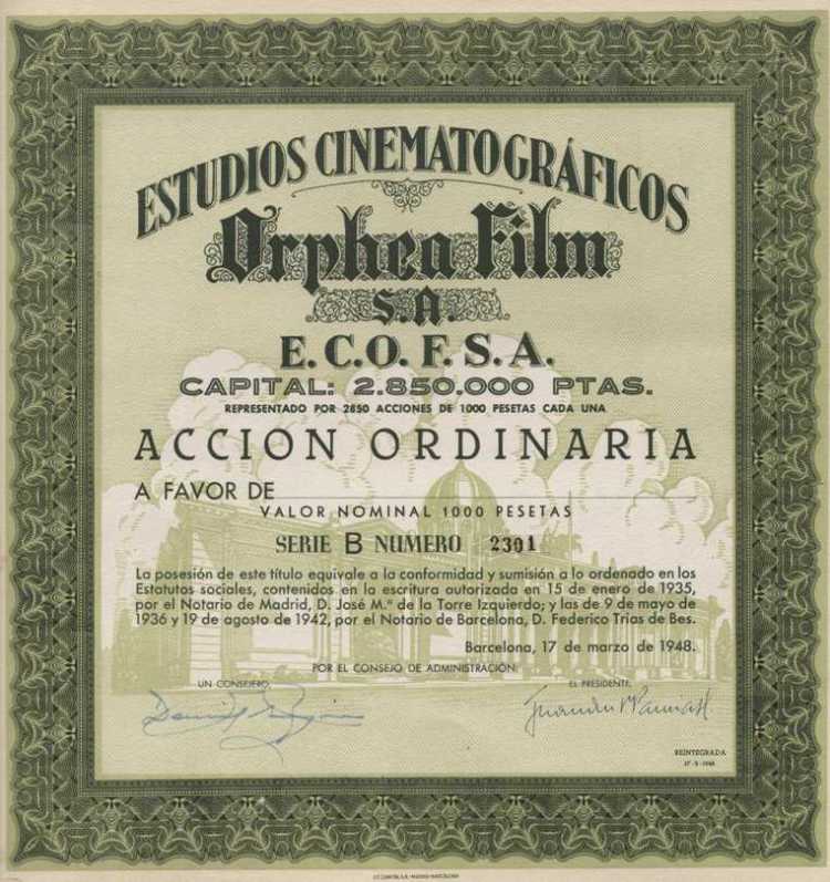 1948 Acción ordinaria Serie B, valor nominal 1000 Pesetas.