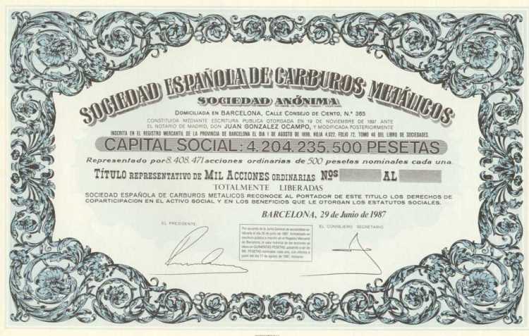 1987 Título representativo de mil acciones de 500 pesetas, sin numerar.