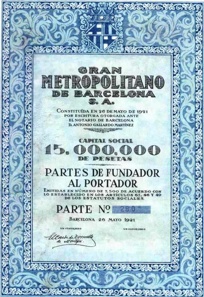 1921 Partes de Fundador al Portador. Falta la firma de Un Consejero.