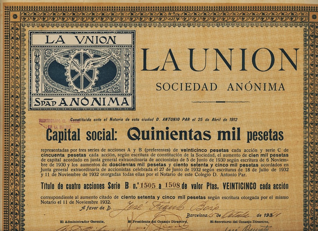 1941 Título de cuatro acciones Serie B de veinticinco pesetas cada acción.