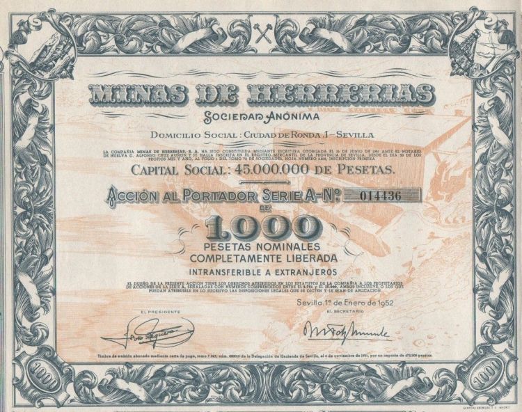 1952 Acción al Portador Serie A de 1000 pesetas completamente liberadas.
