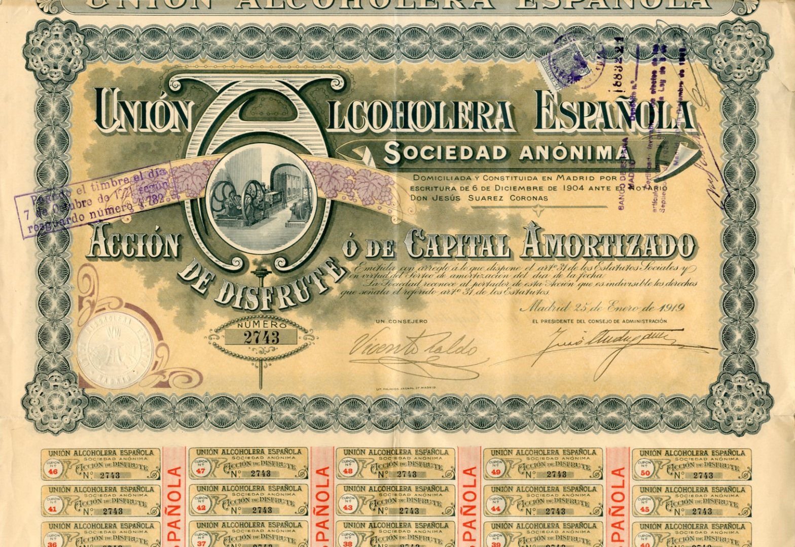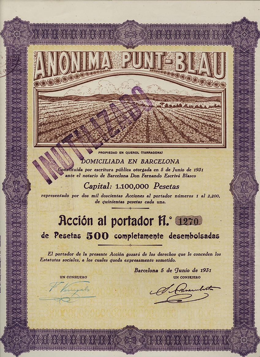 1917 Constituida el 4 de diciembre. Acción de 50 Pesetas, firmada el 6 de diciembre. Curisiodad: sociedad constituida ante la Fe del Notario…» fórmula utilizada.