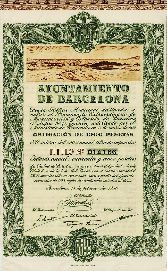1950 Obligación de 1000 Pesetas al interés del 4,50% anual, libre de impuestos. Curiosidad, libre de impuestos.