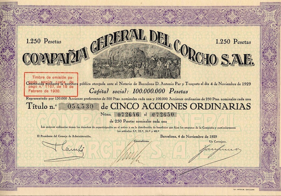 1929 Título de cinco acciones ordinarias de 250 Pesetas cada una.