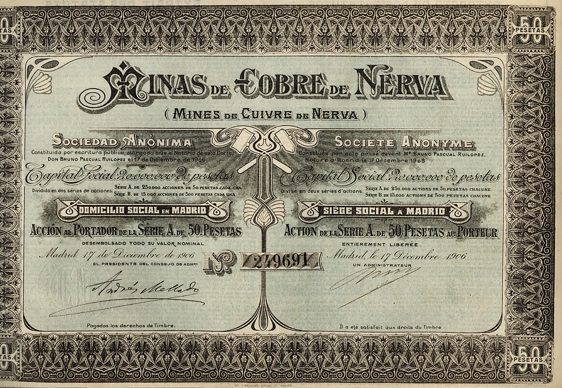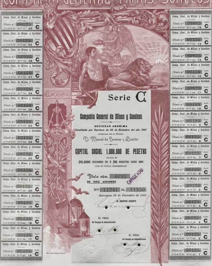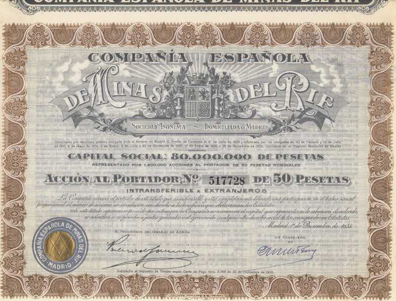 1928 Acción al Portador de 50 Pesetas Consulte otros títulos de la Compañía Española de Minas del Rif también en este sitio.