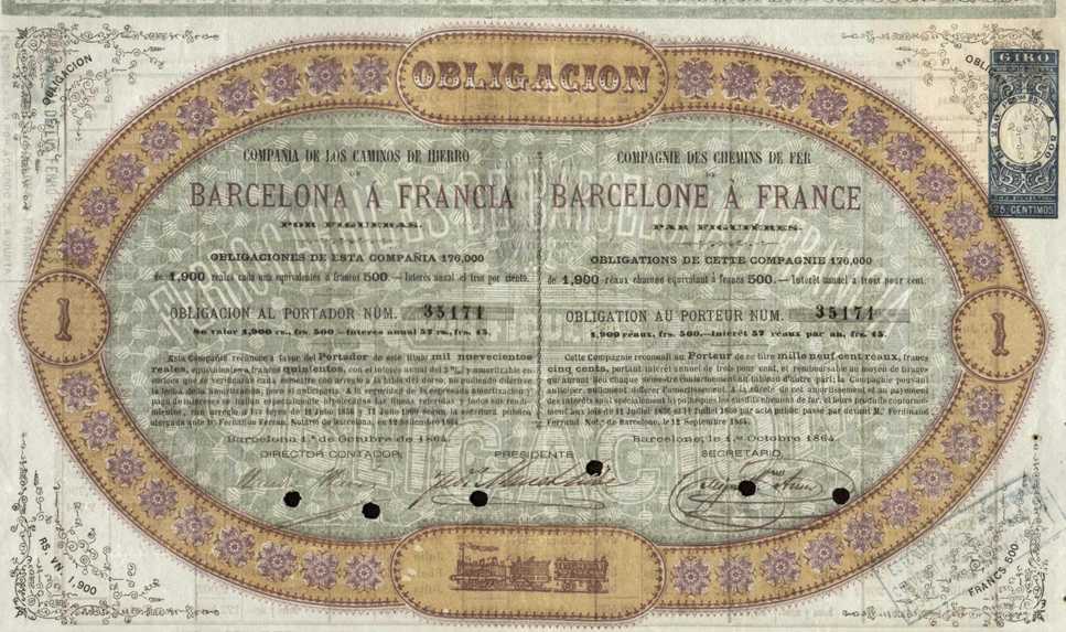 1864 Obligación al portador de 1900 Reales cada una, 500 francos. Curiosidad, o curiosidades, porque en ella se establece el cambio de moneda según la época, la compañía era resultado de fusión de otras anteriores, establecen nuevas vías entre España y Francia, entre muchas otras. Caminos de Hierro de Barcelona a Gerona fue una empresaSigue leyendo «Compañía de los Caminos de Hierro de Barcelona a Francia por Figueras»