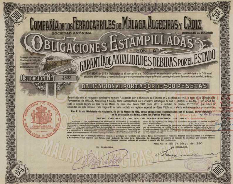 1920 Obligaciones Estampilladas. Obligación al portador de 500 Pesetas al 5% Curiosidad, Garantía de Anualidades Debidas por el Estado.
