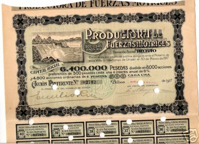 1990 Título comprensivo de una acción ordinaria de 500 Pesetas Últimas acciones de esta compañía histórica, dispone de otras ediciones de títulos de Hidroeléctrica Ibérica Iberduero en este sitio. Mantiene ilustración evocando ediciones anteriores, desde la primera emisión.