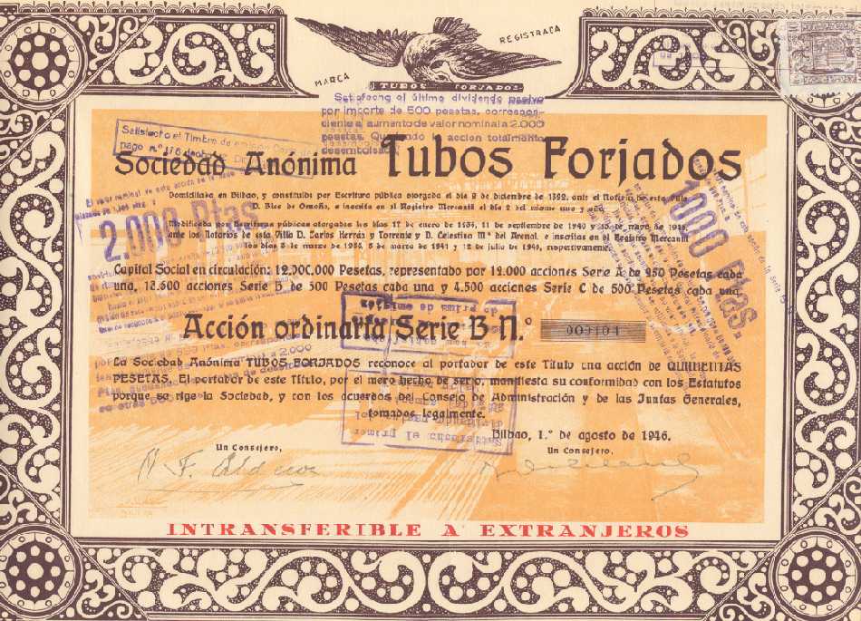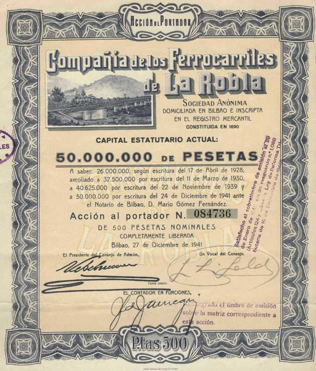 1941 Acción al portador de 500 Pesetas. Completamente liberadas.