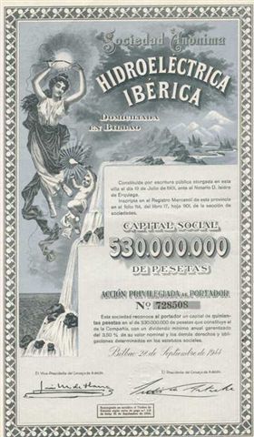 Acción al portador. Bilbao, 3 de junio de 1949. Constituida por escritura pública otorgada en esta villa, el día 19 de julio de 1901, ante el notario de Bilbao don Isidro de Erquiaga. Inscrita en el Registro Mercantil de la Provincia de Vizcaya. Capital Social: 1.018.500.000 Pesetas. Esta sociedad reconoce al portador un capital deSigue leyendo «Hidroeléctrica Ibérica Iberduero»