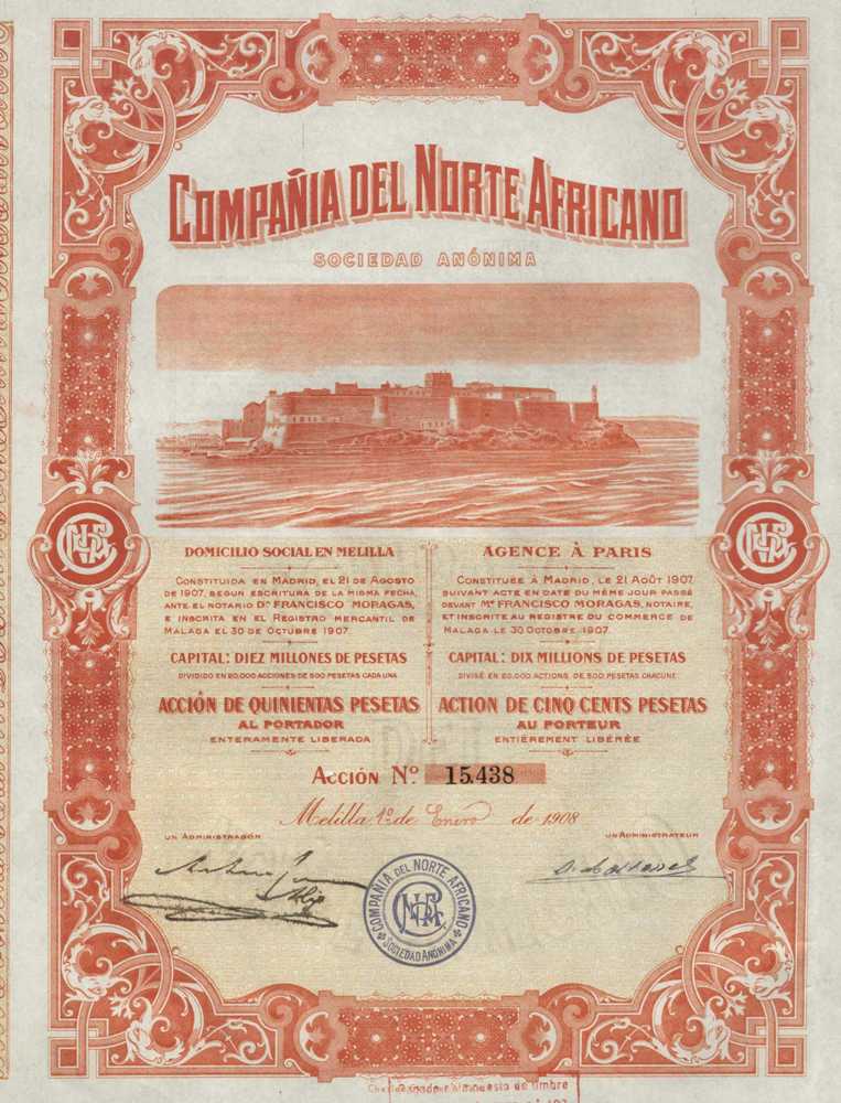 1908 Acción de 500 Pesetas al Portador completamente liberada. Firmada en Melilla.