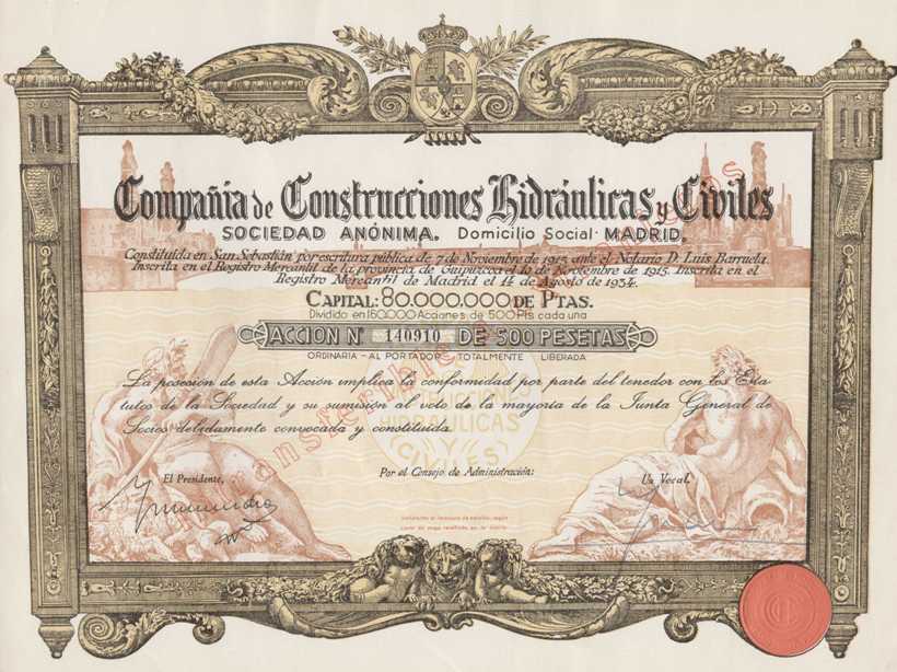 1934 Acción de 500 pesetas. Curiosidad, constituida en San Sebastián en 1915, trasladada a Madrid en 1934. Figura en el título.
