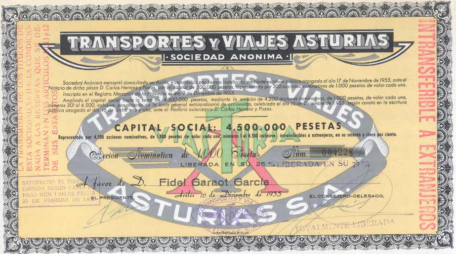 1955 Acción Nominativa de 1000 Pesetas, Liberada en su 25%, 70% y Totalmente Liberada. Curiosidad, liberada progresivamente sellos.